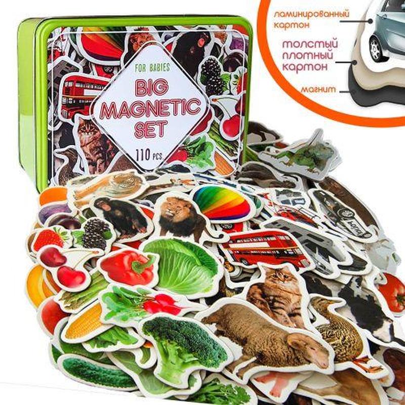 Набор ярких красочных магнитов с изображениями различных животных, фруктов, овощей. Магниты довольно-таки крупные. В комплекте есть 110 магнитиков. Выполнено из качественного и безопасного материала. Для детей от 3-х лет. Упаковка: Коробка Цвет: Разноцветный Вес в упаковке: 990 г Габариты в упаковке: 11 x 18.5 x 9 см Cтрана производитель: Украина Материал: Комбинированный Комплектация: 110 магнитов