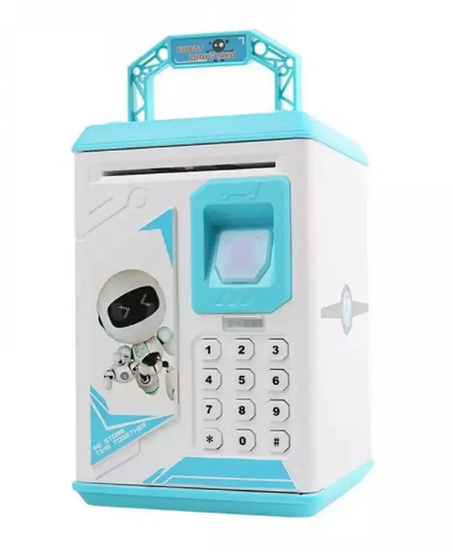 Дитяча скарбничка сейф Robot NBODYGUARD №906 з відбитком, Бірюзовий Завдяки новинці Робот скарбничка Robot Bodyguard ва дитина з великим задоволенням буде відкладати і збирати кошти. Кожна дитина бажає мати власні кошти для покупки іграшок або інших речей. Збирати та відкладати гроші – це довгий, але водночас може бути цікавим процесом. Процес завдяки якому ваша дитина стане більш фінансово грамотною. Особливості та переваги Robot Bodyguard: Приймає купюри та монети. Тепер збирати гроші ваша дитина зможе не тільки копійки, а й купюри. Перевірка купюр на автентичність. Режим ультрафіолету дозволяє перевірити купюри на справжність, для цього слід включити ультрафіолетову лампу затиснувши кнопку з закритими дверима. Після загориться ультрафіолетова лампа і автоматично вимкнеться через 15 секунд Дитяча мелодія. Система переключиться в музичний простір, якщо користувач натисне одночасно, коли двері зачинені. У музичному режимі можна вибирати пісні цифровими клавішами. Індивідуальний пароль Використання пароля для відкриття дверей: введіть пароль (пароль за замовчуванням: 4 6 2 4 )натисніть клавішу відбитка пальця, і система відкриє двері, якщо пароль правильний. Щоб змінити пароль треба відкрити сейф взяти дверцята і натиснути * потім введіть пароль після того як ви ввели пароль натисніть на # і все готово Характеристики: Тип: Скарбничка Матеріал: Пластик Габарити: 19х13х13 см. Живлення: 3 Батарейки типу АА Комплектація: Робот скарбничка Robot Bodyguard Інструкція Заводська упаковка