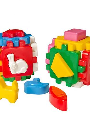 Іграшка - сортер "Розумний малюк". В наборі 2 куби: з геометричними фігурами та фігурами тваринок. Матеріал - пластик. Упаковка - пакет. Розмір - 10х10х17 см.