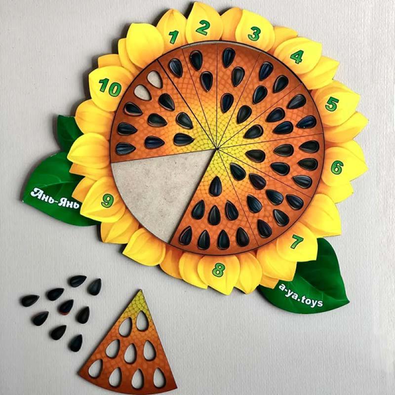 За допомогою такого кольорового математичного соняшнику можна легко вивчити з дитиною цифри і навчити її рахувати. Гра також підходить для вивчення дробів та допомагає в ігровій формі зрозуміти і побачити, що таке "частина і ціле". Насіння - це відмінний рахунковий і сортувальний матеріал.