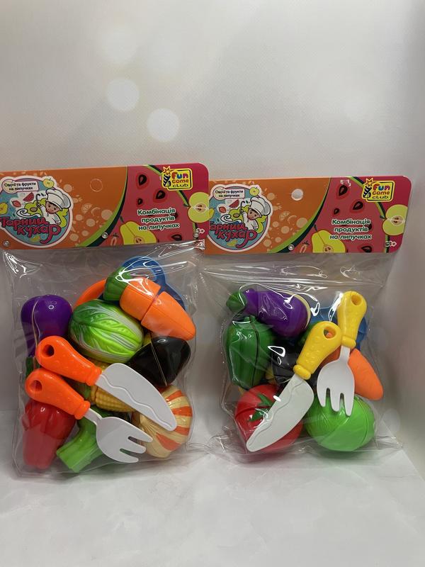 Овочі 8 шт (16 деталей), дощечка, ніж, виделка, тарілка Овочі 6шт (12 деталей), дощечка, ніж, виделка, тарілка. Менший 160, більший 180