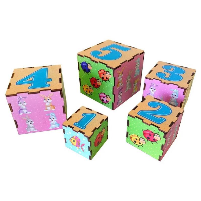 "🏗️ Набір з 5 дерев'яних кубиків для веселого навчання! ✨ Що особливого: ✔️ Кубики різного розміру з яскравими тематичними зображеннями. ✔️ Можна вкладати один в одного, як матрьошку, або будувати вежі. ✔️ Знайомлять дитину з цифрами від 1 до 5: на кожному кубику є цифра та відповідна кількість малюнків. ✔️ Розміри: великий кубик – 85 мм, кожен наступний менший на 10 мм. 🌟 Гра розвиває логіку, моторику та знайомить із першими математичними поняттями! ❤️"