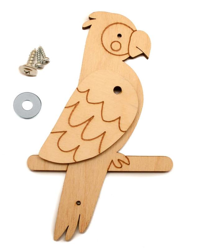 Дерев'яна заготовка для бізіборду: "Папуга" (Не Кольоровий) Заготівля йде в незабарвленому вигляді для фарбування деталей в асортименті нашого магазину акрилова емаль. У комплекті: папуга, крильце, саморізи. Матеріал: висококласна березова фанера. Розмір: 12 х 8 см.