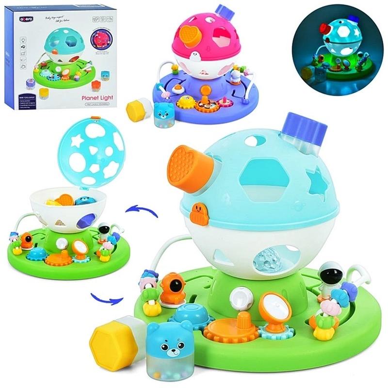Развивающая игра QX-91215E 2цвета, шар на подставке, ночник, сортер, фигуры 4шт (погремушка), шестеренки, лабиринт, подвижные детали, с аксесс., муз., свет., на батар., в коробке 26*25.5*11.5см
