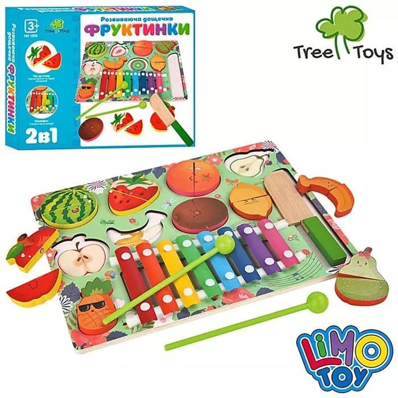 Деревянная игрушка обучающая Доска MD1895 2в1, сортер, рамка-вкладыш, фрукты-пазлы (на магните), разрезные, нож, ксилофон, палочки, с аксессуарами, в коробке 31*24*3см
