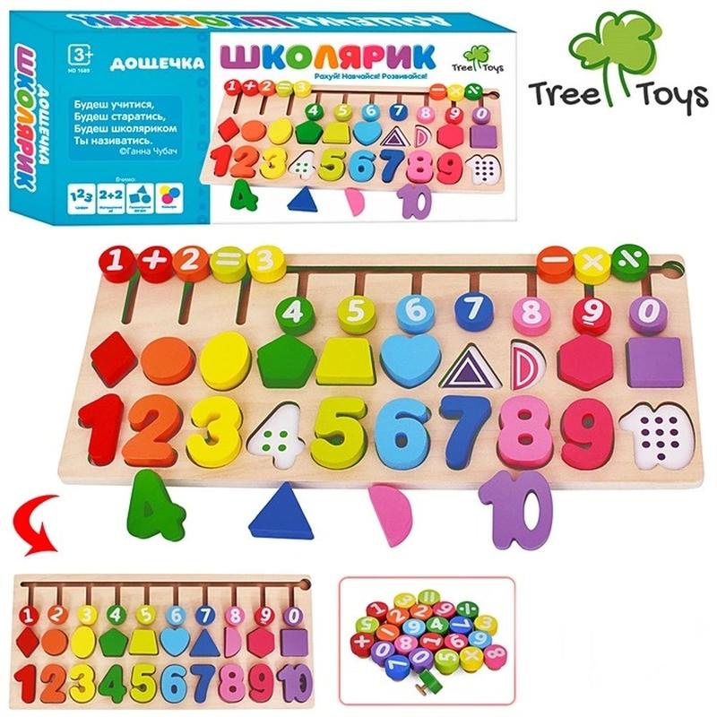 Деревянная игрушка обучающая Доска MD1689 4в1, сортер, рамка-вкладыш (цифры, фигуры), лабиринт, цвета, из аксессуар, в коробке 40*19*5см