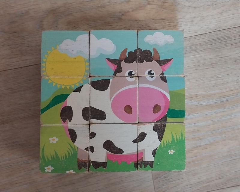 Составляя картинки из частей кубиков, ребенок не только развивает логическое мышление и мелкую моторику, координацию рук и глаз, логическое мышление и ловкость но задействует и зрительное восприятие, память. Уже после нескольких раз сборки кубиков, ребенок будет узнавать животное, которое там нарисовано, его название. Головоломка содержит 9 кубиков с помощью которых можно составить 6 рисунков с разными животными. Подходит для детей от 1 года.. Употребленное, немного затертые (но все видно), потому что очень полюбили их.