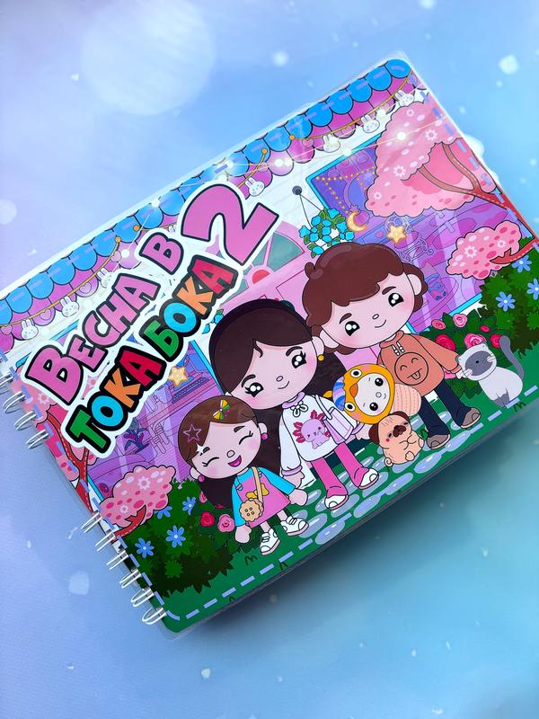 Продолжение легендарного альбома "4 сезона" - "Весна в Тока бока: Часть 2"! 4 персонажа - милая семья. Красивый нежный домик. 200 игровых элементов. 10 игровых локаций: Комната родителей и малыша. Милая комната дочки, которая любит котиков, мишек и кроликов. Много одежды в шкафу у каждого члена семьи. Кухня, веранда с милыми зверушками и вкусной едой. Ванна, где есть все необходимое и для малыша, и для взрослых. Звезда с возможностью кормить животных. Вылазка на природу - даже можно отметить 76. Ну и какая же весна без шоппинга! Огромный магазин одежды и аксессуаров. А еще салон красоты, где вы можете менять прическу, делать маникюр, уход за лицом и подкрепиться чаем. Можно сделать ручку, чтобы носить как сумочку (+100 грн) и оформить в подарочный бокс (+100 грн). Текст на боксе любой.