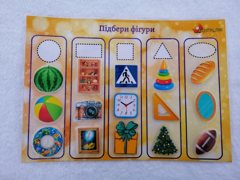 Эта игра поможет ребенку научиться распознавать геометрические фигуры и находить их в предметах повседневной жизни. Малыш разовьет наблюдательность, научится анализировать формы и соотносить их с реальными объектами. Игра также способствует самостоятельному мышлению и развитию творческого воображения. Користь гри: ✔ Ознакомление с геометрическими фигурами ✔ Развитие логического мышления и внимания ✔ Улучшение речи и моторики рук Характеристики: Формат: А4 Материалы: фотобумага 220 г, заламинированный пленкой 200 мкм Крепление: круглые липучки 15 мм Количество съемных деталей: 15 шт. Язык: украинский, русский Рекомендуемый возраст: от 3 лет Игра в легкой и интересной форме познакомит ребенка с основами геометрии и научит распознавать фигуры в окружающем мире.