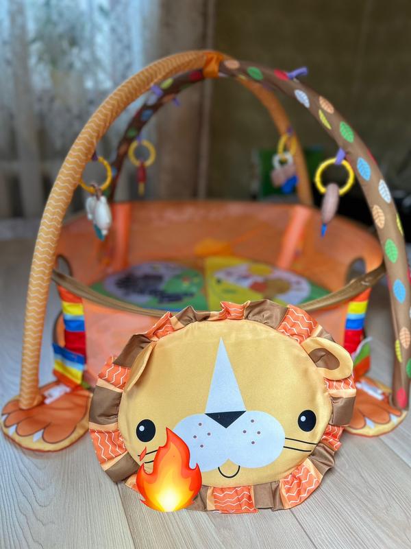 Дитячий ігровий килимок 3 в 1. Призначений для дітей від самого народження. Основною особливістю даного килимка є можливість підняти бортики, організовуючи безпечний простір для маленьких непосид. Він легко складається, що дає можливість брати з собою під час прогулянок або мандрівок. У комплекті є набір пластикових кульок, які зберігаються в голові тваринки, що виконує роль кошика. Бортики підіймаються і опускаються, можна використовувати як килимок так і манеж або басейн для кульок. Має мʼякі безпечні дуги з кріпленням для брязкалець. Виготовлений з мʼякого і приємного на дотик матеріалу, що забезпечує комфорт і безпеку для дитини.