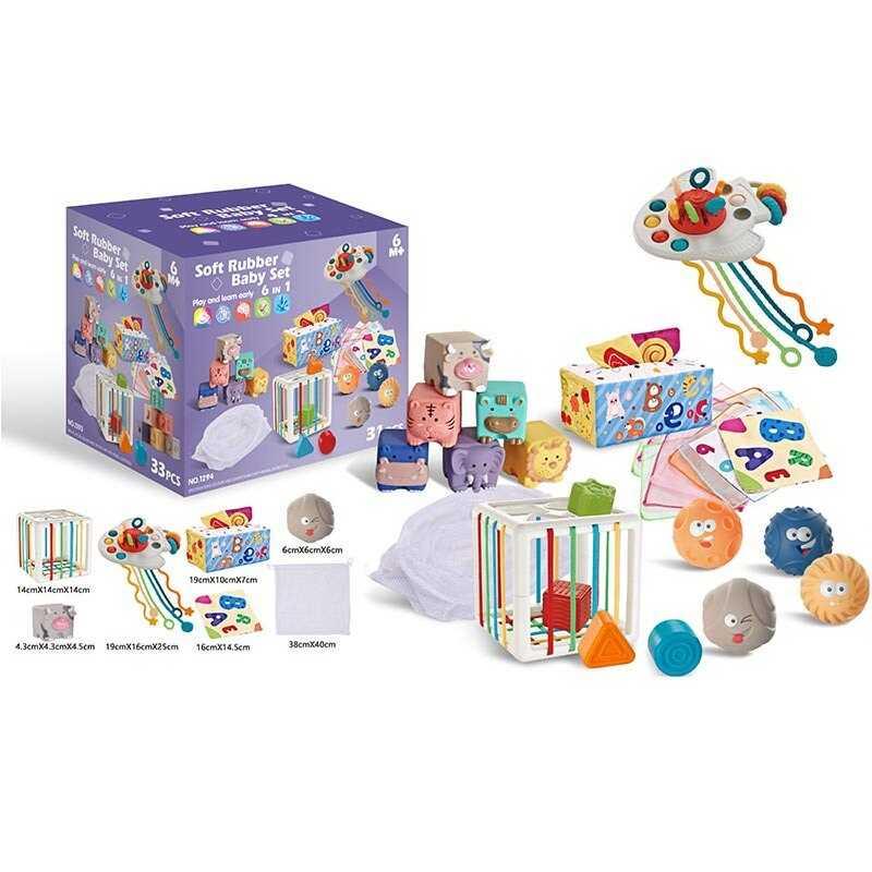 Набор для развития 31 элементов, погремушки, кубики, прорезыватели, пальчиковые игры, мячики, текстильные салфетки, мешочек, куб с формами