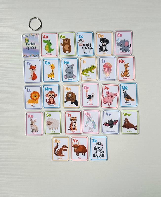 Английский алфавит в "карманном" размере. Удобно брать с собой куда угодно и учиться. Фотопечать + прочная ламинация. Карточки скреплены металлическим кольцом. При необходимости есть индивидуальное исполнение.