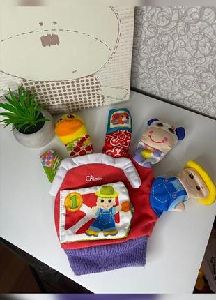 Іграшка рукавичка «Ферма» - це пальчиковий театр з чотирма героями і м’якою книжкою. Особливості: кожен пальчик на рукавичці видає звук: кукурудза шелестить, качечка пищить, миша і корівка дзвенять; м’яка ілюстрована книжка на долоні допоможе освоїти простий рахунок: 1 фермер, 2 овечки, 3 свинки; сприяє розвитку візуального та слухового сприйняття, тактильних навичок. Створюйте щоразу різні історії за участю мешканців ферми — дитина із захопленням спостерігатиме, як ферма оживає! Стан нова (є стріпса). Ціна 402 грн.🏷️