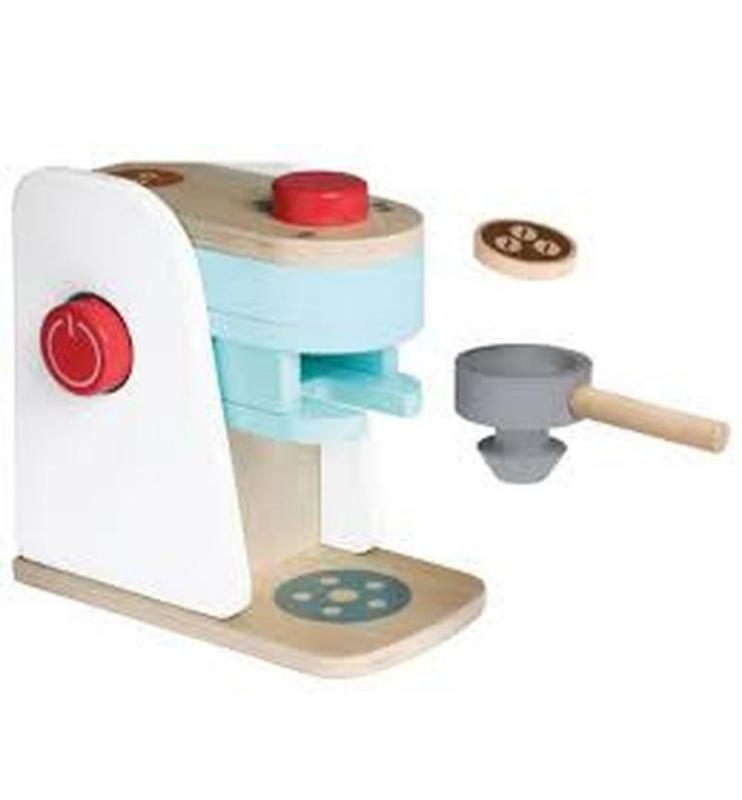 Кавоварка: стойкая деревянная игрушка для игры с приготовлением и питьем кофе в детской комнате с портафильтром, 3-ступенчатой регулировкой и выключателем и 2 чашками из пищевого пластика с 3 кофейными капсулами, 1 упаковкой молока и 2 чайными ложками 9 предметов.