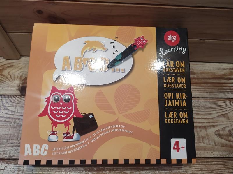 Розвивальна гра з алфавітом для віку 4+, мова — фінська, складається з пазлів-карток і ручки-тестера, для перевірки