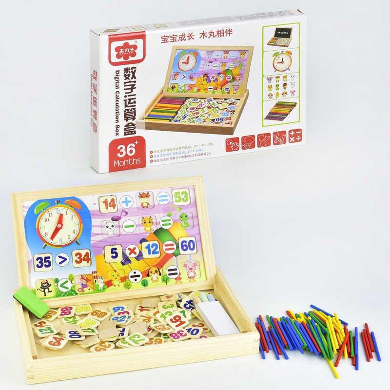 Доска в наборе двусторонняя и выполняет сразу несколько полезных функций: дошка для крейди; доска для сборки примеров из фишек. В комплекте вы найдете набор деревянных разноцветных фишек с изображением цифр, математических знаков и животных, циферблат с вращающимися стрелками, разноцветные палочки для счета, мел и губку для очистки доски. С набором можно играть с самого раннего детства, однако в присутствии взрослых. Размеры / габариты 30х4х20 см