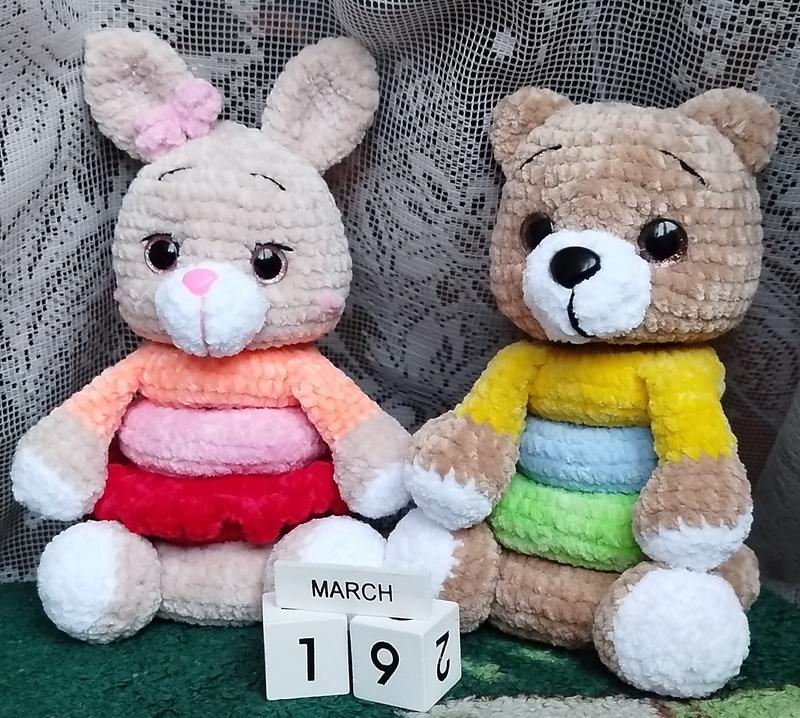 Плюшевая пирамидка. Глаза на безопасном креплении. Рост зайки 25 см. Рост мишки 22см.. Цена за одну