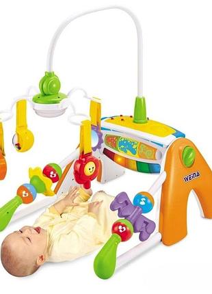 Weina 4 в 1 «Галактика» – (фото 1) многофункциональный центр. Пока ребеночек совсем маленький, центр можно использовать в качестве ночника с приглушенным светом и, если необходимо, тихой приятной мелодией или мобайла на кроватку (мобайл можно применить и на игровом коврике – достаточно воспользоваться подставкой). Мобайл развлечет малыша в часы бодрствования, поможет развить зрение и слух. Ребенку постарше центр можно предложить уже в качестве дуг с подвесными игрушками (эти игрушки можно менять при желании). Яркие, красивые игрушки разной формы, большие ролики обязательно привлекут внимание крохи, вызовут желание потянуться к ним, дотронуться. А это уже само по себе полезная физическая нагрузка и развитие мелкой моторики. Для деток постарше центр превращается в музыкальную клавиатуру. Как же интересно жать на клавиши, самостоятельно создавать мелодии или одним нажатием кнопочки проигрывать уже записанную в памяти центра музыку! А еще когда игра сопровождается световыми эффектами!.. Ни один ребенок не останется равнодушным к такому развлечению.