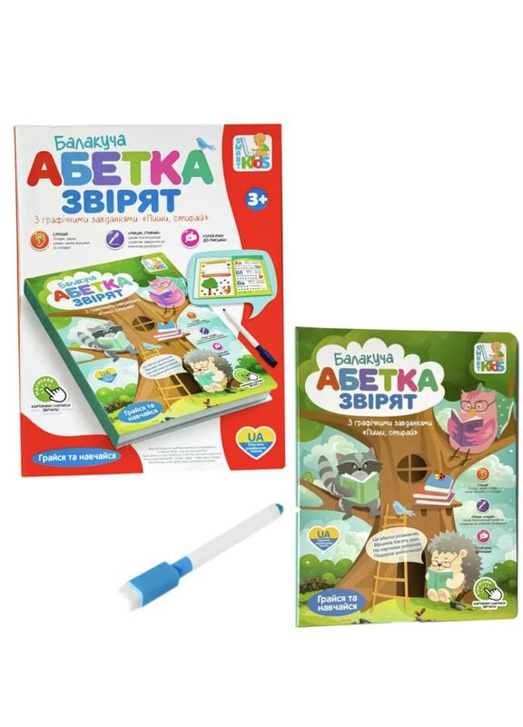 Книга складається з 22 цікавих інтерактивних сторінок з письмовими завданнями на звороті. У наборі є спеціальний маркер для виконання веселих ребусів і завдань, який легко можна стерти спеціальною губкою. Особливості моделі: яскраві малюнки; літери, звуки, слова, склади, вірші на українській мові; пісні про абетку; графічні завдання на кожному розвороті ( пиши, стрирай ); гра "знайди літеру, слово"; регулювання гучності; маркер для малювання. Для того, щоб активувати потрібну сторінку, необхідно натиснути на сенсорну кнопку із зображенням . Кожна сторінка містить різні зображення, при натисканні яких можна почути букву, цифру, фігуру, . Кожнга сторінка навчать дитину алфавіту та кільком словам. З такою навчальною та забавною книжкою малюк поступово вивчатиме навколишній світ і в нього не буде часу нудьгувати! Кількість сторінок: 22 ст. Мова озвучування: українська. Живлення: Книга працює від 3-х батарейок типу "АА" (у комплект не входять).