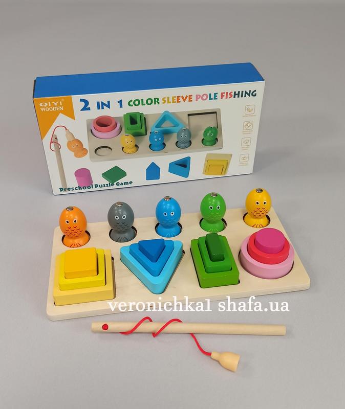 Деревянный сортер, геометрические фигуры, магнитная рыбалка (рыбалка) - предназначена для любознательных детей, которые только начинают познавать окружающий мир! • Цветные рыбки мечтают о новом порядке, а ты можешь помочь им с этим! Возьми удочку и расставь рыбки на доске так, как тебе нравится. После этого можешь развлечься сортируя различные деревянные фигурки по их количеству углов, создавая яркие пирамидки. • Эта увлекательная игра не только доставит ребенку удовольствие, но и поможет развить моторику рук, координацию движений, зрение и логическое мышление. Изготовлена она из дерева и окрашена качественными безопасными красителями, что делает ее идеальной для детского развития. Особенности: • игра 2в1: магнитная рыбалка и сортировка фигурок; • деревянная основа с отверстиями для форм, удочка с магнитом, 5 магнитных рыбок, геометрические фигуры в наборе; • натуральное дерево с безопасным покрытием экологическими красками на водной основе; • геометрические фигуры разные по размеру и цветам; • гладкие края исключают риск ранения; • развитие мелкой моторики и координации движений; • изучение цветов и геометрических форм; • улучшение концентрации внимания и логического мышления; • размер игровой платформы: 22х11х1см.