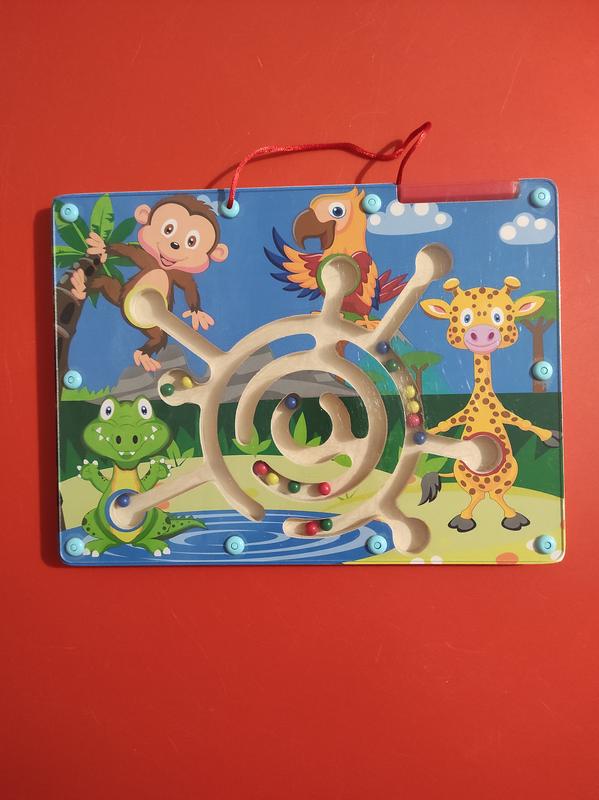 В идеальном состоянии, следы использования. Попытка магнитной палочкой поймать под прозрачным пластиком шарики-магнитики и довести до животных ( жирафа, обезьянки, лягушки и попугая) , тем самым накормив их,- очень занимает,веселит и забавляет детишек.