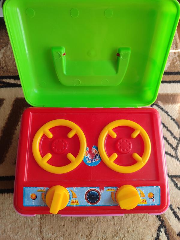 Дитяча плита, під нею ящик для овочів, посуди. Овочі є цільні, є на липучці. Ножі, доска, ложки, ваза