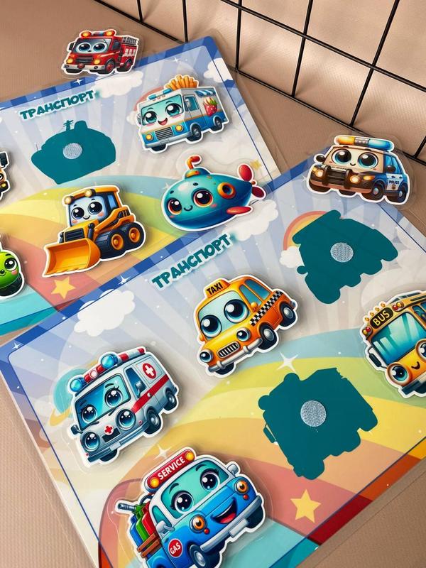 Развивающая игра на липучках "Транспорт" формата А4. Все детали и страницы заламинированы. Детали крепятся на липучках.