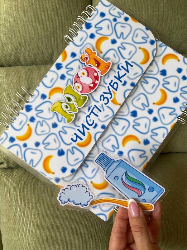 Розвивальна книжка на липучках «Чистимо зубки» — це цікава гра, яка допоможе вашій дитині засвоїти важливі навички гігієни у простій і веселій формі. Малюк вивчає, як правильно чистити зубки разом з кумедною мавпочкою, бореться з мікробами, використовує щітку, пасту та ополіскувач, а також відмічає чищення зубів по днях тижня. 🎯 Розвиває дрібну моторику, пам’ять, логіку та навички самообслуговування 🦷 Формує щоденну звичку доглядати за зубками 📎 Безпечні матеріали, ручна робота, міцна ламінація 🎁 Ідеально підходить для подарунка Всі елементи кріпляться на міцні липучки, які легко знімати та прикріплювати знову. 26 липучих элементів. 🔖 Можна персоналізувати за іменем дитини