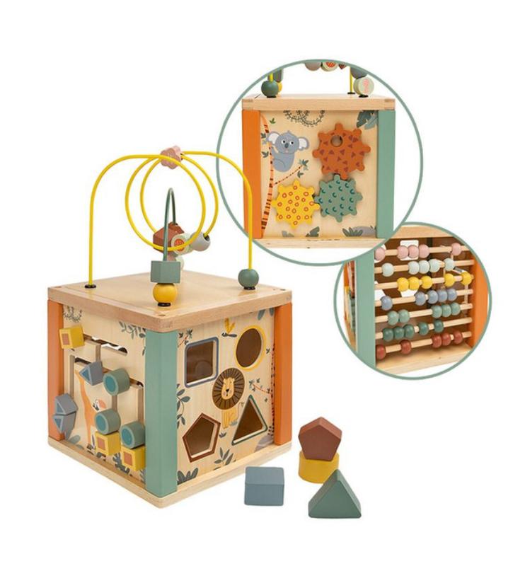 Очаровательная коробка в форме куба с мотивом фигур и цветных элементов от бренда Smiki. Игрушка 5в1: лабиринт аркадная игра счеты сортировщик вращающиеся блоки Особенности игрушки: Каждая стена содержит различную форму развлечения. Красочные счеты и крутящиеся кубики помогут малышу научиться считать. Разноцветные бусины с рисунками помогут вам выучить цвета. Сортер учит распознавать цвета и формы, игрушка позволяет подбирать формы к соответствующим отверстиям. Идеальная игрушка для тренировки мелкой моторики. Изделие из дерева. Основная информация: Возраст: от 18 м+. Размеры: 20х20х20 см. Продукт соответствует стандартам безопасности EN 71.