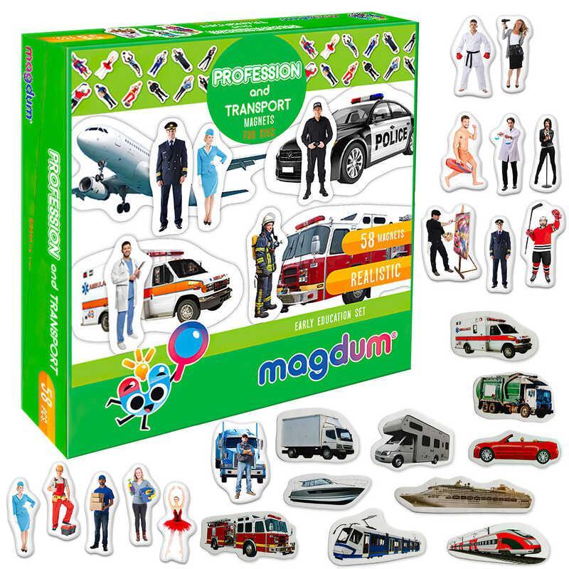 Увлекательный набор магнитов для маленьких исследователей! Набор магнитов "Транспорт и профессии" от Magdum позволяет вашим детям погрузиться в мир различных видов транспорта и известных профессий. Этот набор состоит из 58 магнитов, которые открывают перед малышами безграничные возможности для познания и игры. Игры с магнитами не только развлекают, но и развивают: - логическое и пространственное мышление; - координацию движений; - память и внимание; - словарный запас. Как играть? Вместе с ребенком изучайте названия транспортных средств и профессий. Устройте интересную сортировку магнитов по различным характеристикам или придумайте оригинальные игры! Особенности набора: - Оптимальный размер для детских ручек – до 6 см; - Безопасные магниты без острых углов; - Прочные и долговечные благодаря толщине 3 мм и защитной ламинации; - Легко крепятся на металлической поверхности и снимаются;