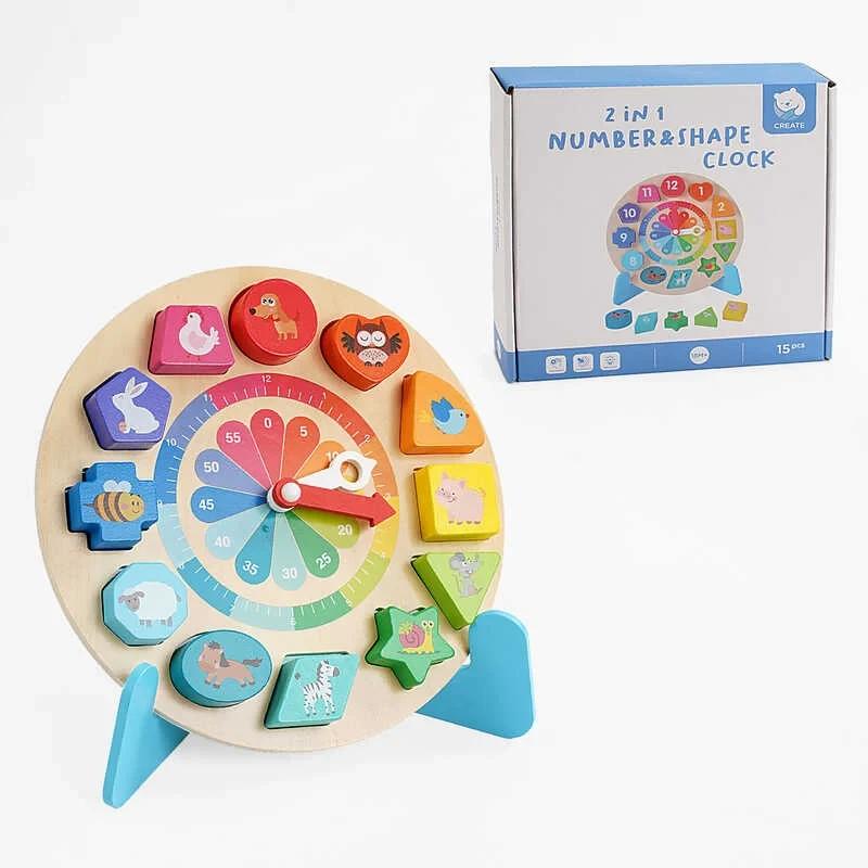 Деревянный часовый сортер "Время и Фигуры" Эта замечательная деревянная игра станет незаменимым помощником для родителей, которые стремятся научить своих любознательных малышей основам ориентирования во времени. Благодаря этой игре ваш ребенок сможет понять, что такое большая и маленькая стрелка на циферблате, а также весело изучить цифры, геометрические фигуры, цвета и названия животных. Набор включает: - основу в форме циферблата с ячейками; - 12 ярких геометрических фигур разных цветов. Основные характеристики: - экологически чистая деревянная игрушка в форме часов; - подвижные стрелки для практического обучения; - функциональный геометрический сортер; - современный и стильный дизайн; - все элементы безопасны, без острых углов; - удобная подставка для часов; - изготовлена из натурального дерева.