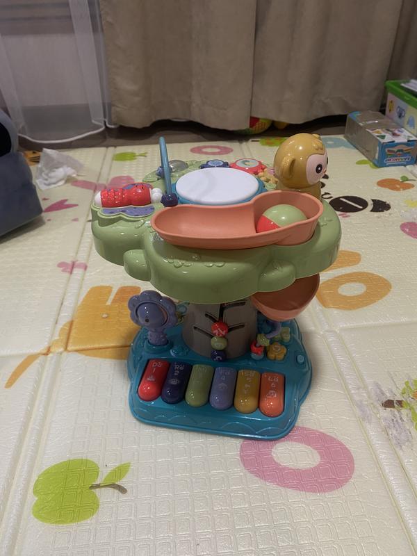 Музичне розвиваюче дерево для малюків Вона має: Клавіші-піаніно з нотами (Do, Re, Mi...) Барабанчик для стуку Фігурки тваринок Кульки для спускання по жолобу Різні кнопки та крутилки для дрібної моторики