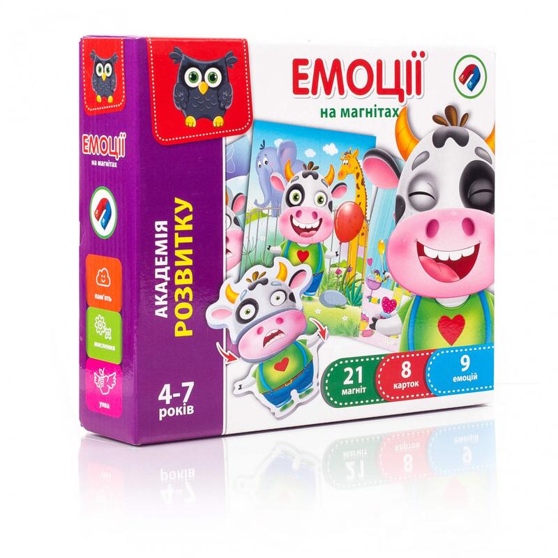 На карточках изображены различные сюжеты. Подбираем к ним магниты так, чтобы собрать из них правильную «эмоцию», соответствующую ситуации. Особенности: мягкие магниты. Комплектация: 8 карточек, 21 магнит. Размер коробки: 210*50*180 мм. Язык: украинский. Возраст: 4-7 лет.