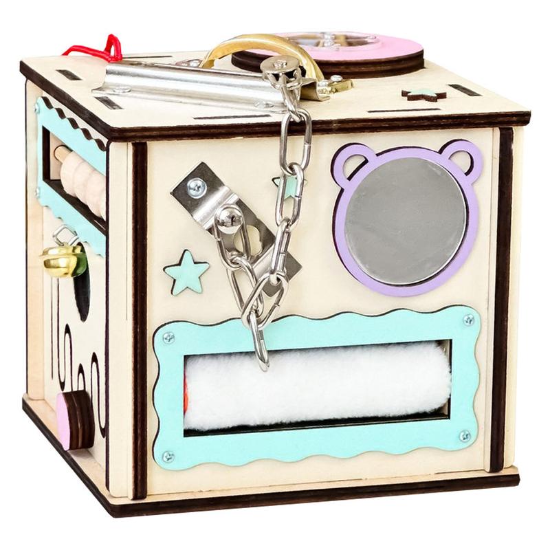 Представляем вам яркую новинку от бренда детских игрушек. Этот красочный бизикубик размером 15*15 не только забавляет ребенка, но и развивает ребенка через естественные интересы и деятельность, а не через использование формальных методик обучения. Бизикубик имеет компактные размеры, поэтому не занимает много места в доме. Его также можно брать с собой в дорогу: так ребенок точно не заскучает в автомобиле. Несмотря на свои довольно маленькие размеры, бизикуб имеет множество игровых элементов: Сортер с геометрическими фигурами для развития восприятия цвета и формы; Музыкальная шкатулка и три шестеренки с бисером - эти элементы познакомят ребенка с простыми механизмами, и улучшат слуховое восприятие; Предметы одежды: липучка, застежка-молния, и яркая шнуровка, где ребенок научится завязывать бантики и шнуровать; Окошко на замочке, где спрятана собачка; Лабиринт-водилка для укрепления пальчиков и кистей рук; Бусинки, которые можно двигать, - для улучшения захвата пальчиков; Часы с подвижными деревянными стрелками; Вращающийся барабан с цифрами и различными рисунками для того, чтобы учить ребенка считать.