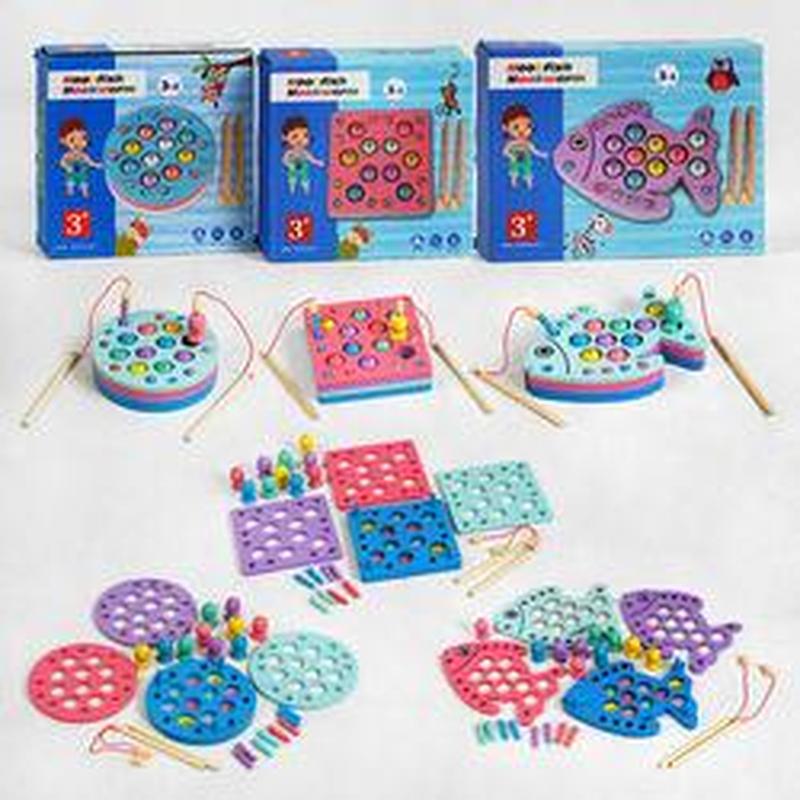 Потіште маленьких дослідників цікавою грою, у якій вона із задоволенням виловлюватиме рибок та діставатиме з отворів кольорових хробачків. Ігрове поле складається з 4-х кольорових сегментів, які нашаровуються один на інший, утворюючи імпровізовану водойму. Кожна з рибок має свій колір та цифрове позначення, якому відповідає певна комірка з цифрою. Завдання малечі спочатку правильно розташувати рибок, а потім упіймати їх за допомогою вудочки з магнітним наконечником. Особливості: - ігрова платформа має розкладну конструкцію; - 10 рибок пронумерованих від 0 до 9; - 8 кольорових хробачків; - вікова категорія - 3+ років; - у комплекті представлені 2 вудочки; - іграшка виготовлена з якісної деревини; - ігрові елементи пофарбовані нетоксичною фарбою, безпечною для здоров’я дитини.