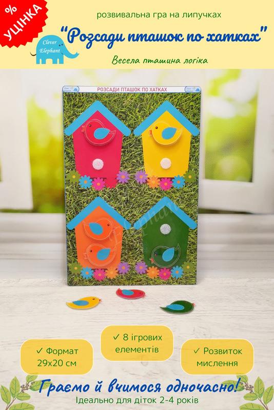 Материалы: фотобумага, пленка для ламинирования, липучки Размеры поля: 29х20 см Размеры элементов: 4х5 см Количество элементов: 8 шт Размеры липучки: 1,5 см Состояние: витринный образец 5/5 Что развивает эта игра: + Предостережение и соответствие + Сортировка по цвету + Координация движений и мелкая моторика + Язык Эта милая игра знакомит малышей с цветами и тренирует логическое мышление. Задача простая и захватывающая - разместить каждую птичку в ее доме. А еще это отличное упражнение для мелкой моторики, ведь все элементы крепятся на липучки. art. CH25127 Смотрите другие Мои объявления - объединяйте заказы и сэкономьте на доставке! Слава ЗСУ!