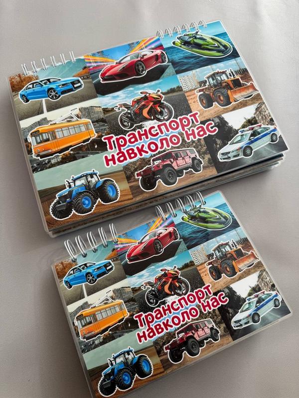 Книжечка на липучках «Транспорт» 🚘 10 сторінок із машинками, літаками🛩️, корабликами ⛴️та спецтехнікою🚜 — 46 липучих елементів — Розвиток логіки, уваги й моторики. Формат А4