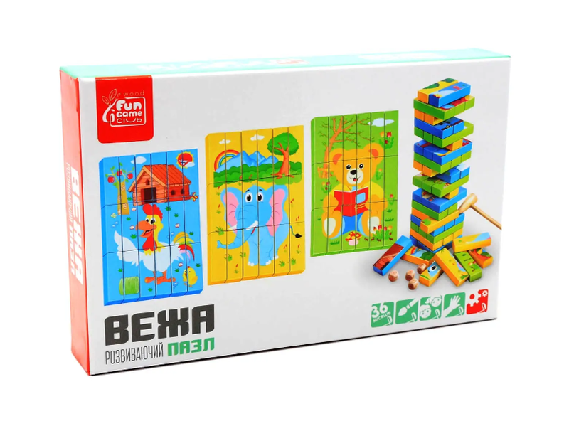 Настольная игра Башня - пазлы (Дженга, Джанг, Башня, Jenga, Vega) Fun Game Деревянная игра пазлы Башня - это залог веселого, а самое главное, полезного времяпровождения для всей семьи. Принцип игры - очень простой. Из деревянных брусков складывается башня, а участники, по очереди, вытягивают из нее брусья таким образом, чтобы башня не разрушилась. В комплекте вы найдете специальный молоточек и 3 игральных кубика. Главная особенность модели – пазлы, из которых собираются 3 картинки: медвежонок, слоник и петушок. Размеры / габариты - Длина (см): 7 см - Ширина (см): 2 см - Высота (см): 1.5 см Размер упаковки: 26 см × 5 см × 16 см Возраст: от 3 лет В наличии 2 шт. Натуральное дерево.