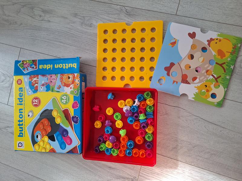 Развивающая игра для малышей, направленная на развитие мелкой моторики, координации рук и глаз, а также творческого мышления. Содержание: Набор включает 12 картинок-основ для создания изображений и 46 цветных кнопок. Принцип игры: Дети подбирают и прикрепляют кнопки к соответствующим местам на карточках, создавая яркие изображения. Возрастная категория: Предназначена для детей от 3 лет. Особенности: Способствует распознаванию цветов, счетби и изучению базовых узоров через интерактивную игру.