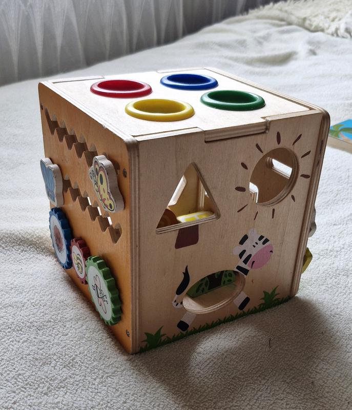 развивающий деревянный бизикуб -Монтесоори для младенцев. 👶 Эта игрушка предназначена для: 👆Развиванию мелкой моторики и координации рук и глаз благодаря разнообразным элементам, таким как сортер форм, лабиринт с бусинами, шестеренки и другие интерактивные детали. 👆Стимулирование когнитивного развития путем распознавания форм, цветов, решения простых задач и логическое мышление. 👆Обеспечение безопасной и долговечной игры, поскольку изготавливается из высококачественного дерева с использованием нетоксичных красок. 👆Поощрение самостоятельного обучения и исследования, в соответствии с принципами Монтессори-педагогики. (без коробки)