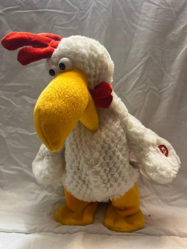 Это плюшевая игрушка в виде курицы, известная как "Erwin the Würgehuhn". Игрушка имеет белый вьющийся мех, крупный желтый клюв и желтые лапы. На голове у нее красный гребень, а на шее – красный бант. На левом крыле есть красная кнопка, которая, активирует движение курицы, если поднять за шею имитирует звуки петуха.