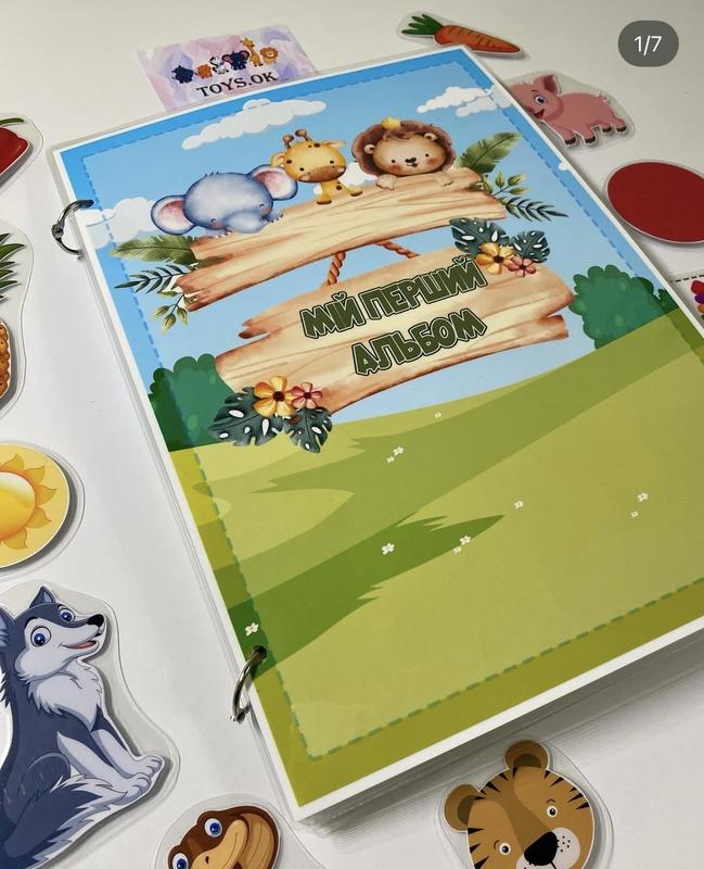 Альбом на липучках « Мій перший альбом » В цьому альбомі є всі ігри щоб комплексно розвивати малюка: Фрукти Свійські тварини Дикі тварини Хто де живе Хто що ість Підбираємо мордочки Професі їх транспорт Кольори- фігури Пори року Чистимо зубки Розмір А4