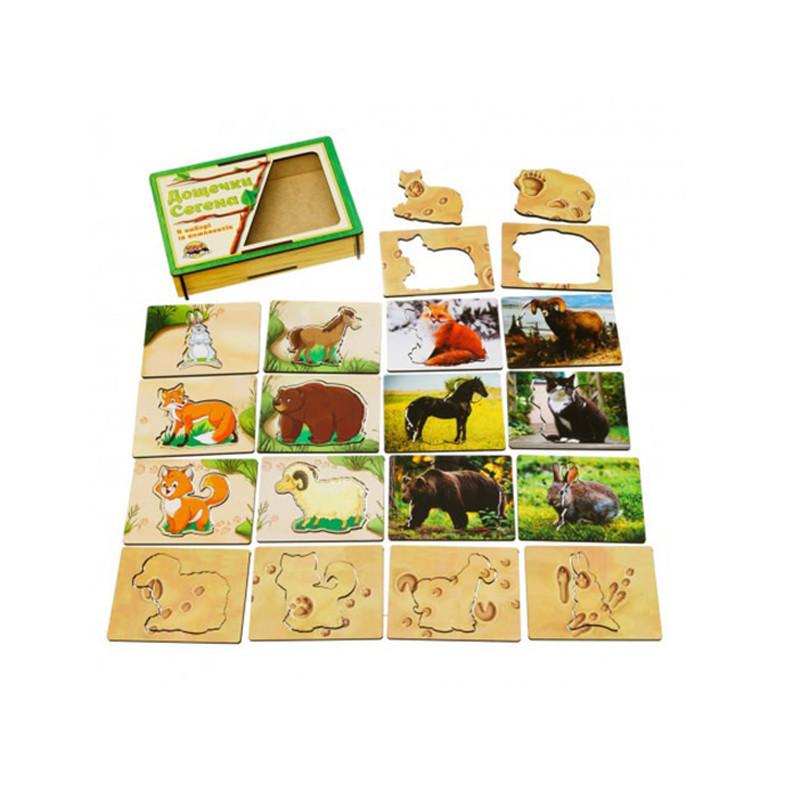 Игра состоит из 18 досок: фото реальных животных, эти звери, но иллюстрация и следы зверей. Предложите малышу найти каждому животному свой "домик-рамочку", а затем подобрать к ним вкладыш-след. Обратите внимание ребенка на то, что каждая фигура-вкладыш должна совпасть с нужным "домиком" не только по форме, но и по рисунку. Произносите названия животных, таким образом малыш запомнит их легко и быстро. Чем полезны игры с рамками вкладышами: 1. Развитие мелкой моторики. Из-за манипуляций с вкладышами ребенок прекрасно развивает пальчики. 2. Восприятие цвета и формы. глазомер. Совершенствуется зрительно – моторная координация. (Ребенок учится визуально оценивать и сопоставлять формы и цвета, подбирая их друг к другу). 3. Развитие зрительной памяти. 4. Знакомство с разными формами. 5. Развитие мышления.