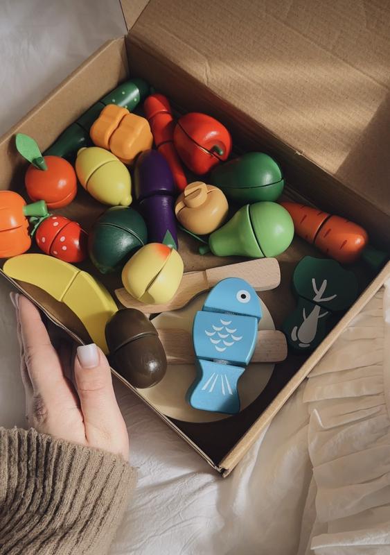 Ігровий набір овочів та фруктів- 22 елементи. 🍱 У комплекті 22 ігрових аксесуари, виконаних із натурального дерева. Овочі та фрукти на липучках, в набір входить також тарілка та ножі. Рекомендований вік: 2+. Розмір коробки: 31.5*22.5*6.5 см. Ціна: 1330 грн.