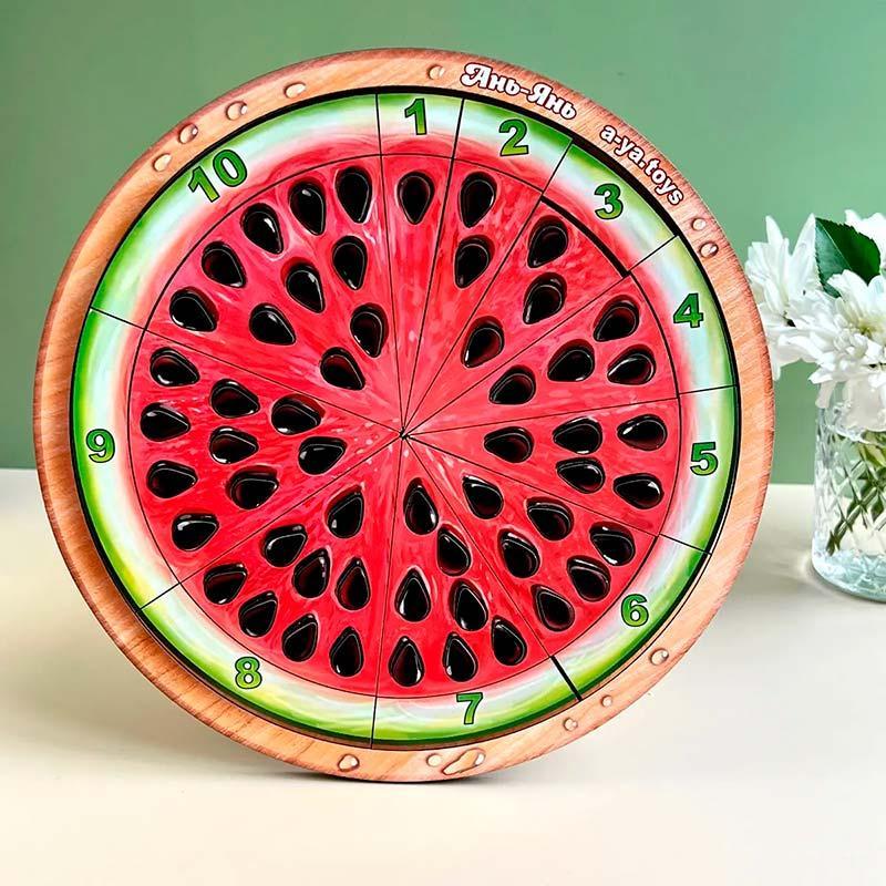 С помощью такого цветного математического арбуза можно легко выучить цифры и научить ребенка считать. Также эта игра помогает малышу в игровой форме понять что такое "целое" и "части". Семена – это отличный материал для счета и сортировки.