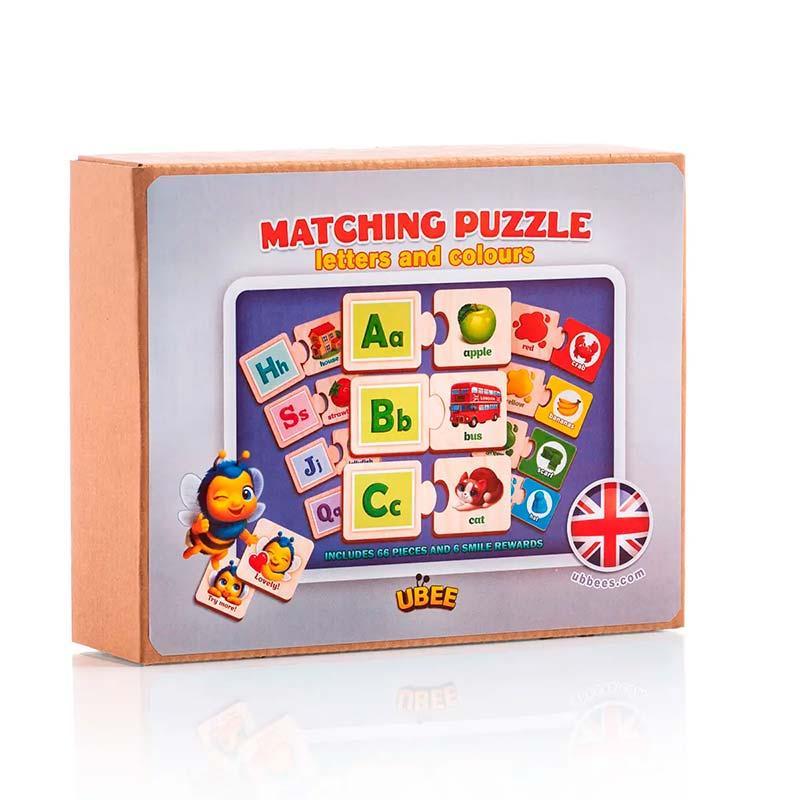 Развивающие Пазлы половинки Английский алфавит цвета дерево Ubumblebees дерево 3+ (ПСД253) В наборе 33 пары пазлов (26 – алфавит, 7 – изучение цветов)