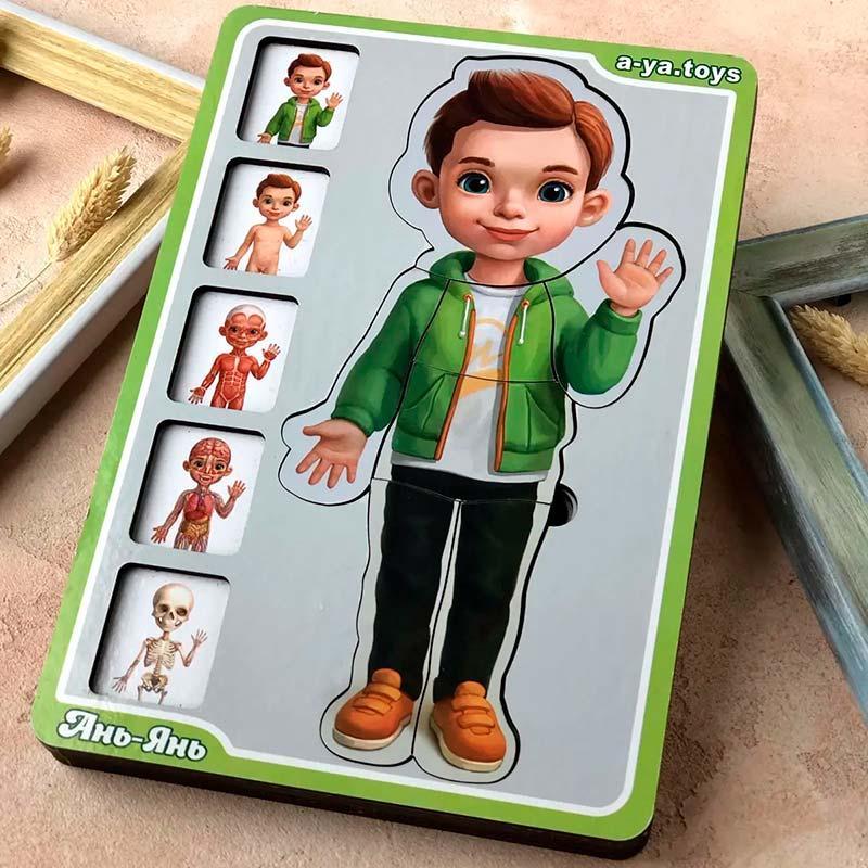 Сортер-пазл "Анатомия человека – мальчик" 5 слойный Ubee ПСФ026 Сортер-пазл В«Анатомия человека – мальчикВ» (ПСФ026) — это многослойный деревянный пазл, который помогает детям в увлекательной форме познакомиться со строением человеческого тела. Играя, ребенок изучает скелет, мышечную ткань, кровеносную систему, кожный покров и внешний вид человека в одежде. В Основные характеристики: - Количество деталей: 38 - Материал: дерево (ХДФ) - Возраст ребенка: от 3 лет В Преимущества: - Развивает логическое мышление и мелкую моторику - Способствует развитию воображения и зрительной памяти - Стимулирует познавательный интерес к анатомии - Безопасные и экологичные материалы Этот сортер-пазл станет отличным подарком для любознательных малышей и полезным учебным инструментом для родителей и воспитателей. Спешите купить уже сегодня!