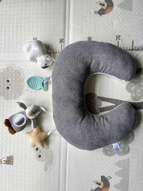 Двостороння подушка для немовлят для ігор на животику. Стан ідеальний Біла сторона мʼяка на дотик, нагадує велюр. Сіра сторона тканина. Додатково є іграшки, які добре пришиті: - гризунець - мʼякі іграшки - безпечне дзеркало