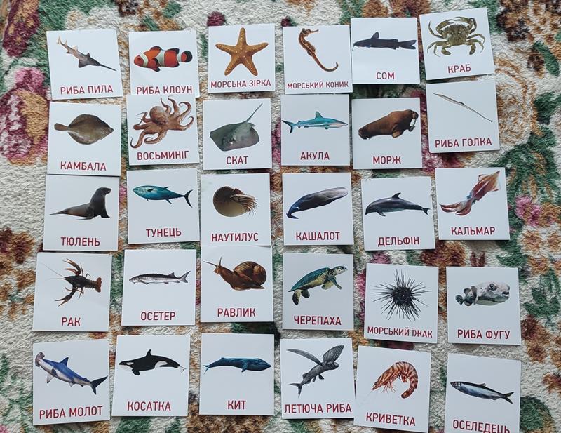 Карточки Домана - морские звери, состояние идеальное. размер 10*10., 30 шт. укр язык. Картон. Карточки для развития деток. Можно использовать в различных учебных играх.