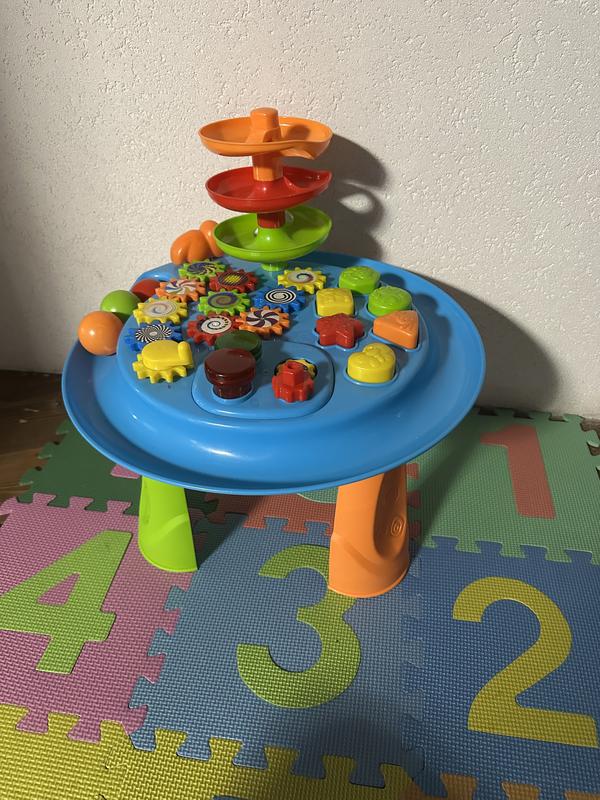 Розвиваючий столик Smiki. Стан нормальний, є місця де пластик побілішав, на експлуатацію не впливає. В наборі столик зі знімними ніжками, вежа для кульок, кульки та молоток-ключ, фігури сортеру. Є три щітка, шестерні, що можна покрутити, вежа з кульками та стучалочка, сортер.